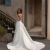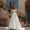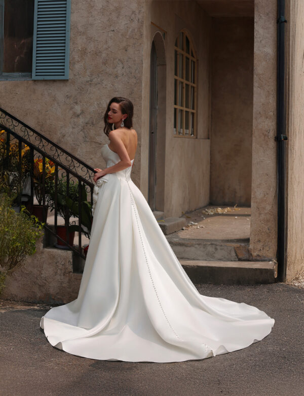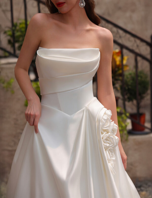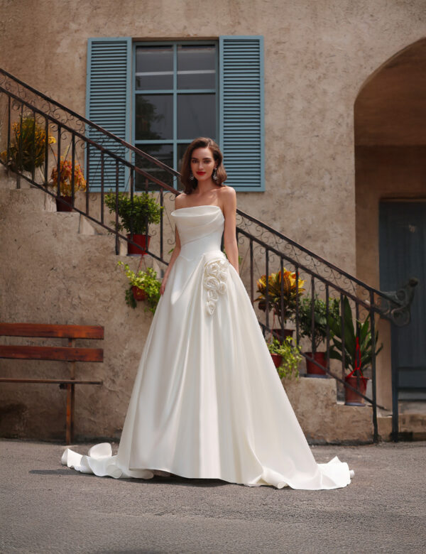 Cette robe de mariée exquise incarne une élégance intemporelle grâce à son design bustier, mettant en valeur un décolleté gracieux. Le corsage se distingue par un drapé travaillé avec finesse, créant une silhouette douce et romantique, tandis que le satin de haute qualité apporte une brillance luxueuse et un toucher soyeux. Un détail remarquable vient sublimer l’ensemble : une délicate application florale sur le côté, ajoutant une touche féminine et un charmant effet tridimensionnel. La jupe ample et fluide s’étend jusqu’à former une magnifique traîne, offrant une allure royale et sophistiquée à chaque pas vers l’autel. Idéale pour les mariées à la recherche d’un équilibre entre beauté classique et finitions raffinées, cette robe promet de laisser une impression inoubliable lors de ce jour unique.