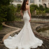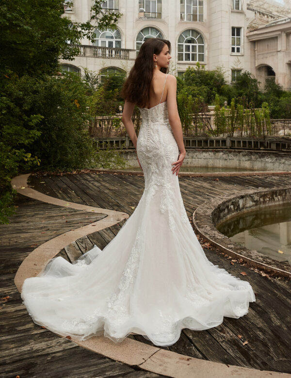 Le décolleté plongeant en V se prolonge par de fines bretelles qui mènent à un dos AVEC des boutons de perle exquis.
