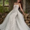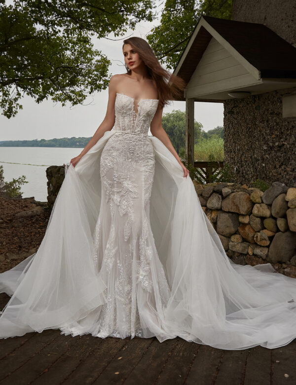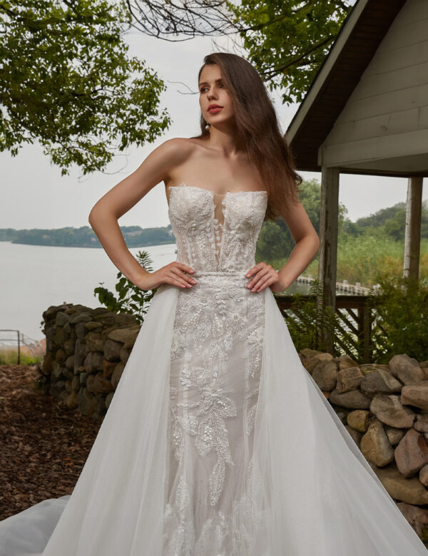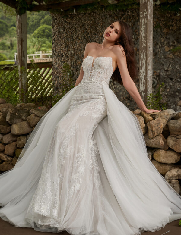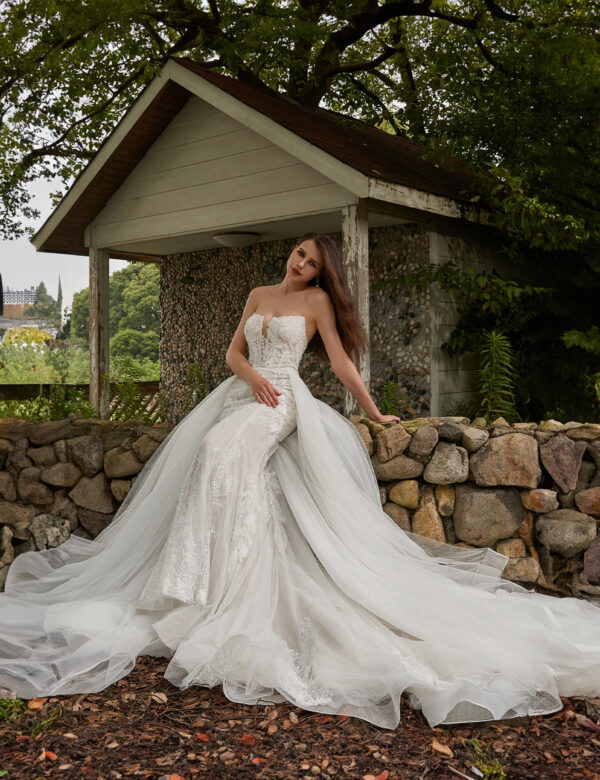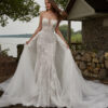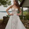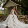 La broderie florale 3D en perles et cristaux a une allure de conte de fées.La longue jupe en tulle amovible vous offre deux looks en un.
