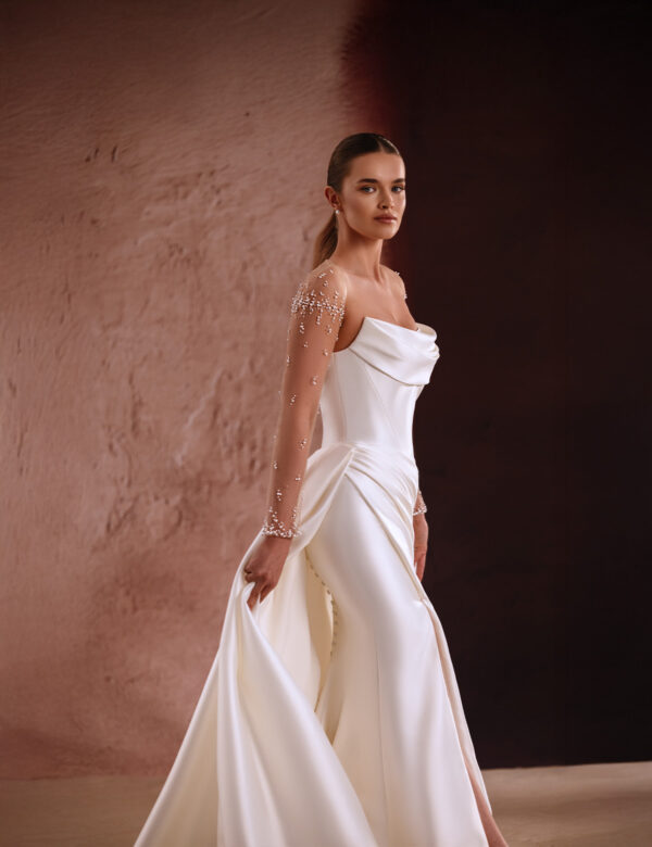 Cette robe de mariée épouse les courbes avec élégance grâce à sa coupe ajustée et son drapé raffiné. Son boléro en tulle illusion, rehaussé de perles délicates, apporte une touche de romantisme et de modernité. Un modèle à la fois épuré et sophistiqué, parfait pour une mariée qui recherche un équilibre entre simplicité et détail précieux.