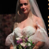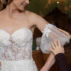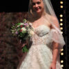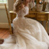 Découvrez notre robe Bella, mettant en valeur des motifs floraux frappants et audacieux. Les appliques de dentelle florale, ornées de perles et de paillettes, scintillent sur toute la robe. Son décolleté en cœur et son corsage transparent ajoutent une touche d’élégance subtile. La silhouette simple en A-line complète l’extravagance créée par les détails floraux et les paillettes. La jupe ample en cercle et le train de 70 pouces ajoutent une dimension de grandeur cohésive. Un choix idéal pour un look saisissant lors de vos occasions spéciales ! Possibilité d’ajouter deux manchons et voile assortie, offrant ainsi une polyvalence raffinée.