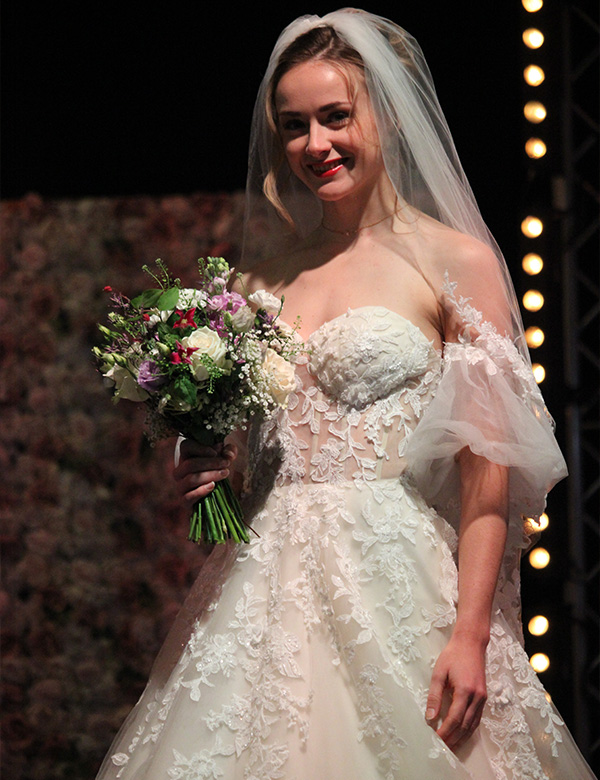 Découvrez notre robe Bella, mettant en valeur des motifs floraux frappants et audacieux. Les appliques de dentelle florale, ornées de perles et de paillettes, scintillent sur toute la robe. Son décolleté en cœur et son corsage transparent ajoutent une touche d’élégance subtile. La silhouette simple en A-line complète l’extravagance créée par les détails floraux et les paillettes. La jupe ample en cercle et le train de 70 pouces ajoutent une dimension de grandeur cohésive. Un choix idéal pour un look saisissant lors de vos occasions spéciales ! Possibilité d’ajouter deux manchons et voile assortie, offrant ainsi une polyvalence raffinée.