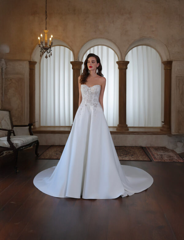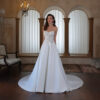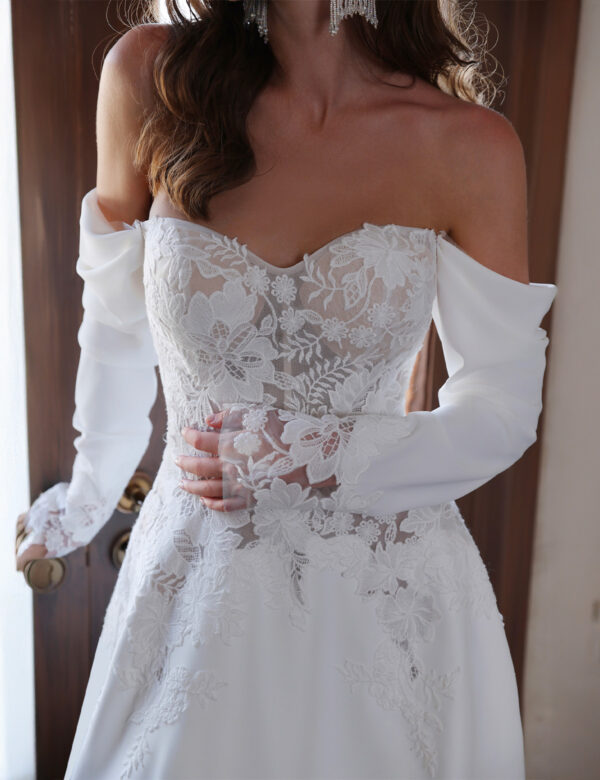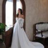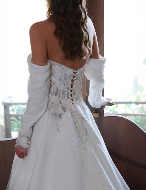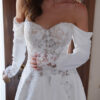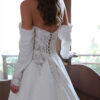 Cette robe de mariée enchanteresse se distingue par son design épaules dénudées, avec des manches volumineuses qui apportent une touche de caractère et de sophistication. Le corsage est orné d’une dentelle florale délicate et travaillée, créant une allure à la fois romantique et raffinée. Le décolleté cœur souligne la féminité, tandis que les détails en dentelle se prolongent dans le dos, sublimés par un laçage élégant de style corset. La jupe fluide, d’un blanc immaculé, s’étend gracieusement jusqu’au sol pour former une magnifique traîne. Alliance parfaite entre modernité et charme bridal intemporel, cette robe est idéale pour les mariées souhaitant faire une entrée inoubliable.