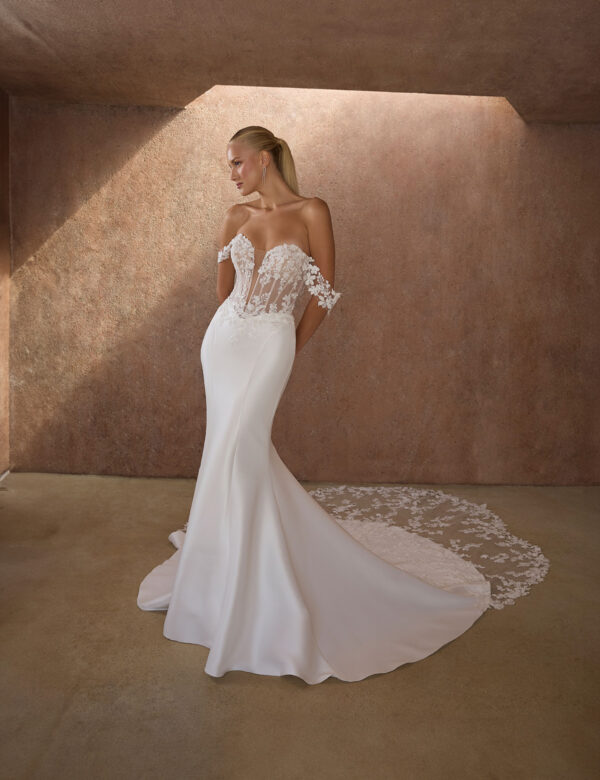 Son bustier en dentelle transparente apporte raffinement et sensualité, tandis que sa jupe et sa traîne en mikado offrent une touche de modernité et de majesté.